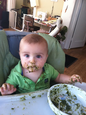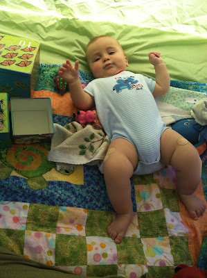 Kai is officially mobile. He rocks on all fours, and pulls himself along in a surprisingly fast army crawl. It's fun to see what interests him: the computer, certain toys, mommy. He gets really excited when I come home and nearly launches himself out of the nanny's arms to get to me.