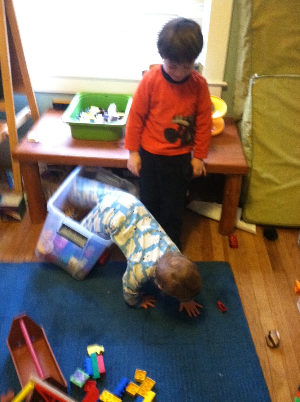 Xander looks on (and Mommy does, too, with a camera) as Kai flings himself out of the Lego box after a failed attempt to get up on the table. |